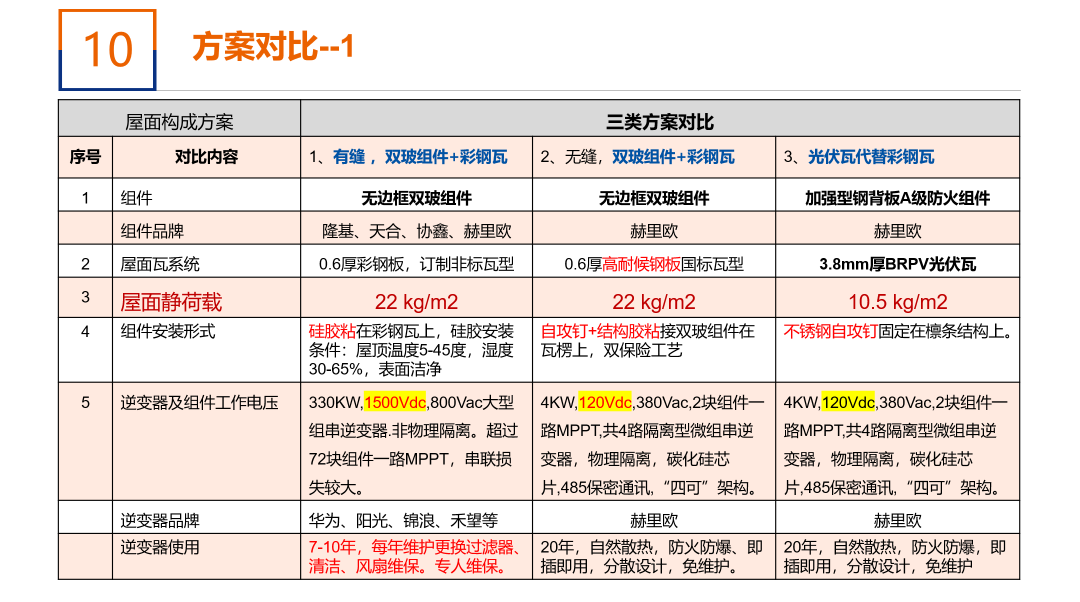 方案1、采用彩钢瓦+无边框双玻组件630W+组串式逆变器。屋面组件系统面高压,600-1500V。组件嵌入在订制彩钢瓦内,上下组件的间隙留100mm,采用卡扣及硅胶安装固定。彩钢瓦重量7kg./m2,双玻组件重量16kg/m2,二者合计22kg/m2。屋面组件面电压1500V。组件的背面MC4接头置于彩钢瓦的瓦沟内。逆变器采用330KW的大型组串逆变器。