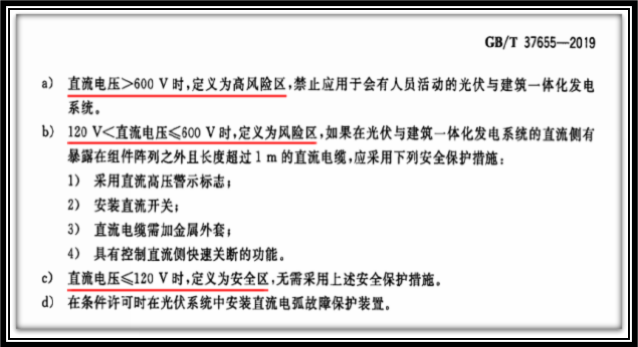 中国标准GB/T37655-2019《光伏与建筑一体化发电系统验收规范》6.7条定义直流电压≦120V时,为安全区,无需采用安全保护措施。同时定义高于该电压所有电缆必须加装金属外套和直流拉弧快速关断控制。明确120V电压为中国所有“建筑光伏一体发电系统”的安全电压限值。验收规范第6.7条 关于直流侧电压验收标准规定如下: